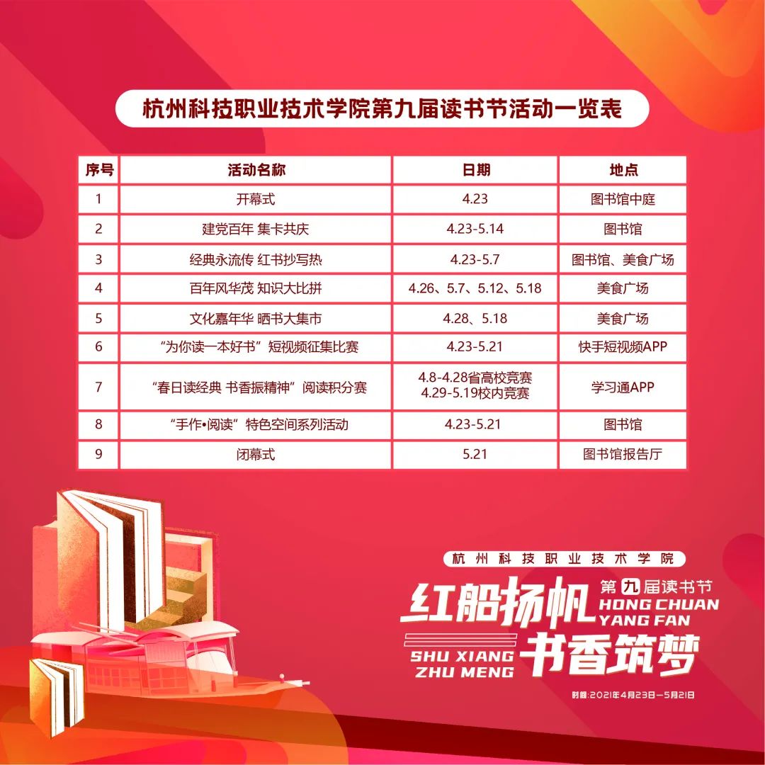 本届读书节紧扣“红船扬帆 书香筑梦”主题,充分结合党史学习教育,共将开展9项丰富多彩的子活动,通过“线上+线下”双线并进的形式,引导师生徜徉知识书海,弘扬红色力量,在校园内掀起一股阅读、求知、崇学的红色热潮。