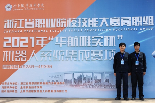 4月30日,2021年浙江省职业院校技能大赛高职组“机器人系统集成”赛项在金华职业技术学院落下帷幕,我校智能制造学院羊荣金、陈敏捷老师带队指导,机电一体化技术专业1802班史展和1901李升组队参赛。两位参赛选手不畏强手,沉着迎战,准确判断,熟练操作,最终喜获一等奖。