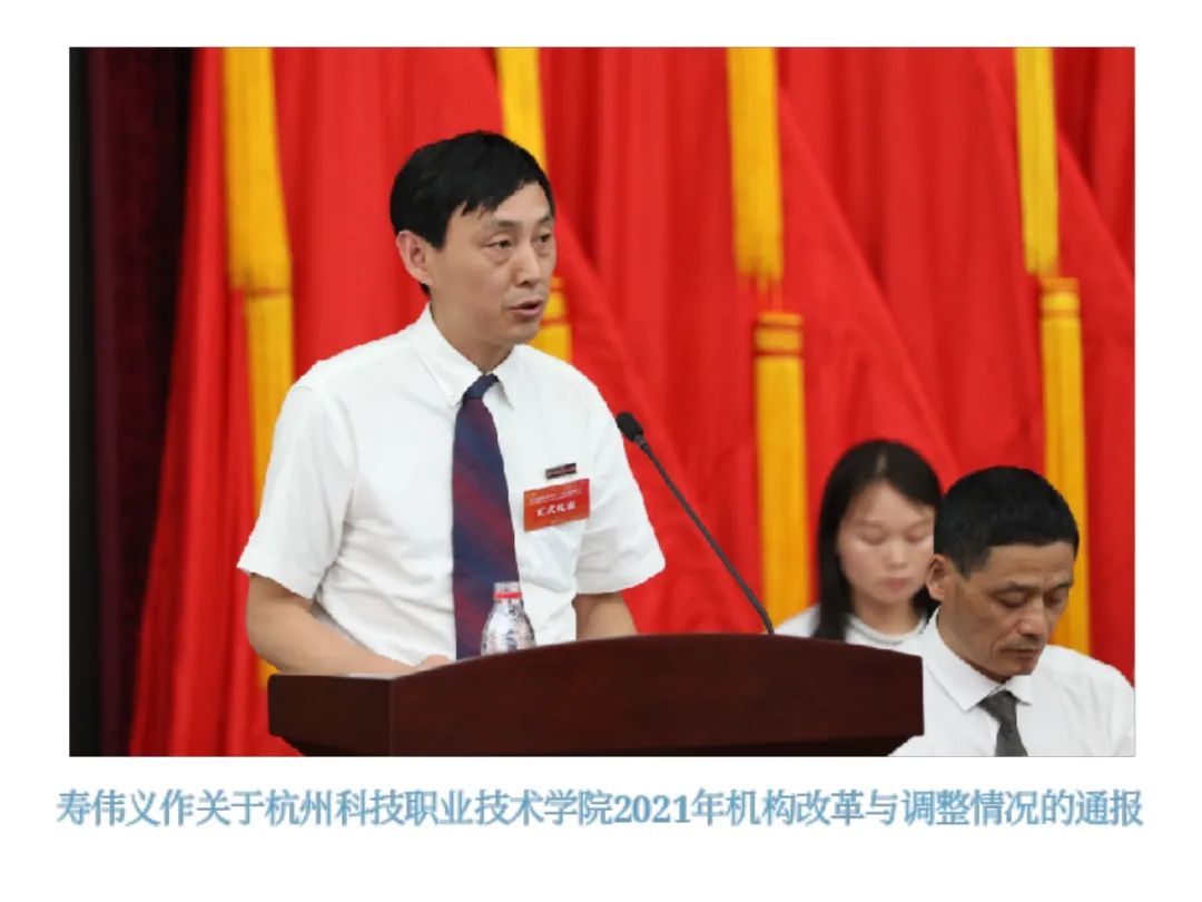 大会听取了何树贵作关于杭州科技职业技术学院《“十四五”教育事业发展规划纲要(审议稿)》的说明;副校长寿伟义作关于杭州科技职业技术学院2021年机构改革与调整情况的通报;计划财务处处长徐磐作学校财务工作报告。大会还审议了学校工会财务工作报告、工会经审工作报告。