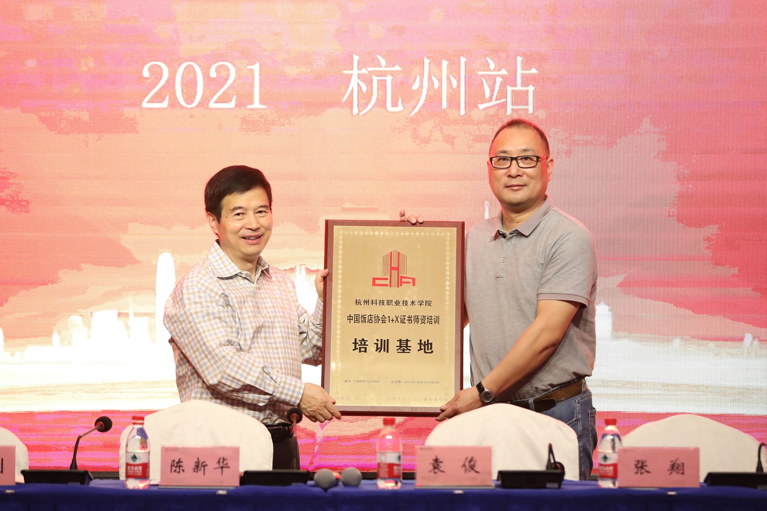 中国饭店协会副会长陈新华、中国饭店协会教育学院副院长张翔、中国饭店协会人力资源专委会副主任孙雷和杭州科技职业技术学院副校长袁俊出席了5月10日举行的开班仪式。陈新华代表中国饭店协会为我校授牌,确认我校为全国首家中国饭店协会“1+X”证书师资培训基地。