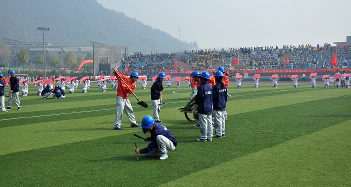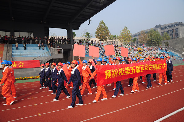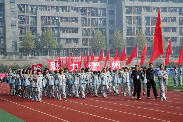 伴随着雄壮有力的《运动员进行曲》,护旗手护送鲜艳的五星红旗步入田径场。22支师生代表队喊着响亮的口号,迈着矫健的步伐依次走过主席台,接受校领导检阅。入场式结束后,还举行了师生广播操比赛和城建学院、机电学院、旅游学院、成教学院的学生团体操汇报表演。