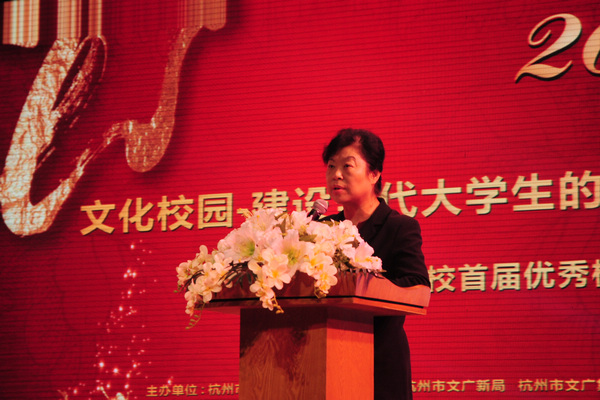 杭州市委宣传部副巡视员史玉芳在会上讲话。她指出高校的发展,从微观看,是比硬件,比师资,比专业特色,但从长远看,就是比理念,比风骨,比文化。一所高校培育出的子弟,应该有专业学养,有专业才能,更应该有母校赋予他的独特的精神气质。她希望各市属高校要以本次优秀校园文化展演活动为契机,进一步加强对校园文化建设的研究、规划和投入,努力培育更为丰富、更有特色、更具影响力的校园文化精品,积极营造健康、高雅、先进、文明的校园文化,为我市的社会发展和文明进步培养更多的杰出人才。