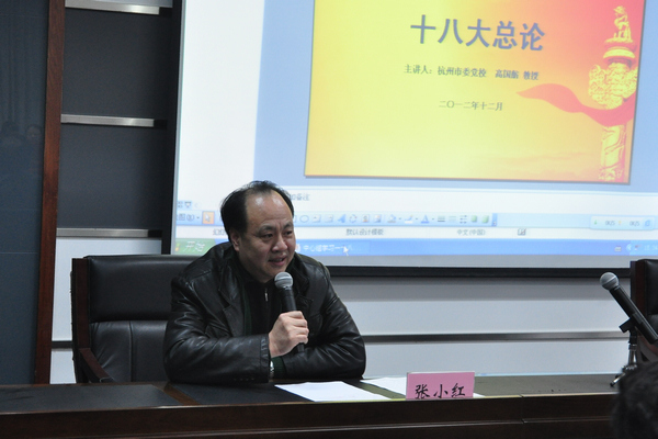 12月28日下午,学校召开党委理论学习中心组扩大会议,邀请杭州市委党校政治学与统战教研部主任高国舫教授来校宣讲十八大精神。校党政领导班子全体成员、全体中层干部、各党总支和党支部书记、思政课教师代表参加学习。党委副书记张小红主持会议。