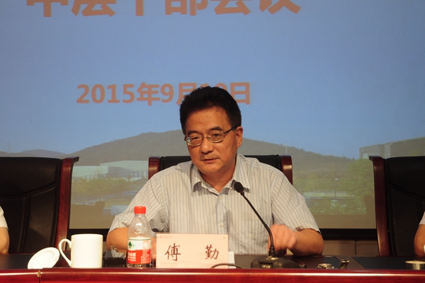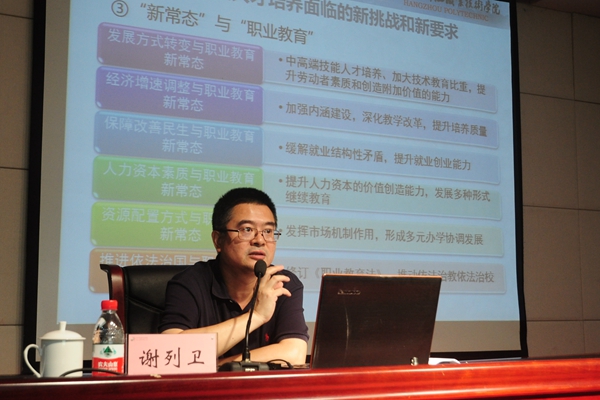 校长谢列卫围绕创新高职人才培养模式作了主旨报告。谢列卫用生动的语言、丰富的实例分析阐述了何谓高职人才培养模式及高职人才培养面临的新挑战和新要求,并从我校人才培养模式现状入手,就如何创新人才培养模式发表了独到的见解。谢列卫认为,高职人才培养模式应当以培养适应生产、建设、管理和服务第一线需要的高素质技术技能人才为根本任务,以校企合作、工学结合为基本途径,以需求为主线和目标来设计教学体系和培养过程,以应用为主旨和特征构建课程结构和教学内容。当前,我校在人才培养过程中还存在专业耦合度不高、复合型人才培养不够、企业参与度不够、职场文化打造不够、信息化手段和仿真教学不足、教学做融合度不高等问题。对此,谢校长提出下一阶段要做好三个方面的工作:一是调整专业布局,努力培养复合型人才;二是深化产教融合,协同推进项目实施;三是构建人才培养新模式,注重职业发展能力培养。谢列卫强调,全体中层干部要以目标为引领,以问题为导向,以项目为支撑,以队伍为保障,积极谋划本部门的“十三五”规划。