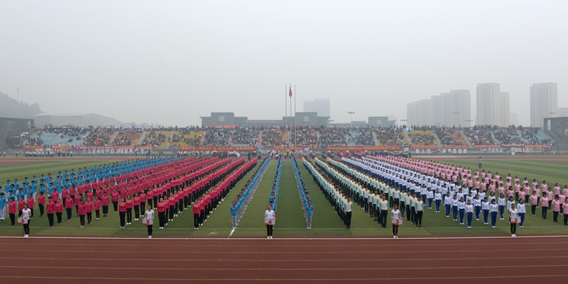 在激昂的运动员进行曲声中,护旗手迈着有力的步伐护送鲜艳的五星红旗步入田径场。21支师生代表队踏着青春的步伐依次走过主席台。入场式结束后,还举行了师生广播操比赛,场面宏大。本届运动会将持续两天,21支代表队的运动员将参加34个项目的角逐。教工趣味运动会也在同期举行,共设乒乓球、跳绳、拔河及亲子活动等10个项目。其中,亲子活动是今年新增加的教工趣味项目,包括亲子共读好温馨、亲子动手好创意、亲子陪伴好开心、亲子携手比一比等活动。