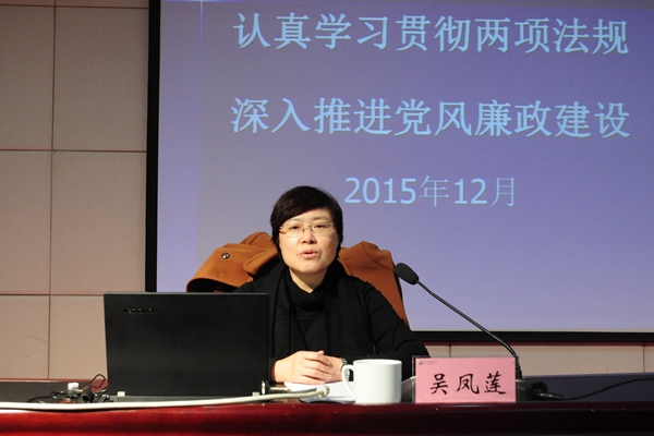 12月9日,我校在陶研馆召开党委理论中心组(扩大)学习会暨党风廉政建设报告会。杭州市纪委常委、监察局副局长吴凤莲应邀来校作《认真学习贯彻两项法规,深入推进党风廉政建设》专题讲座。党委理论中心组成员、全体处科级干部及党支部纪检委员参加会议,会议由党委书记傅勤主持。