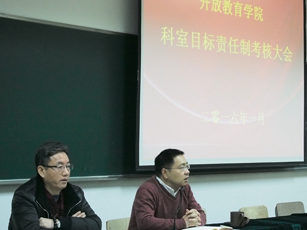 1月7日,开放教育学院召开2015年度科室目标责任制考核大会,学院全体教职员工参加会议,会议由学院党总支书记冯国文主持。