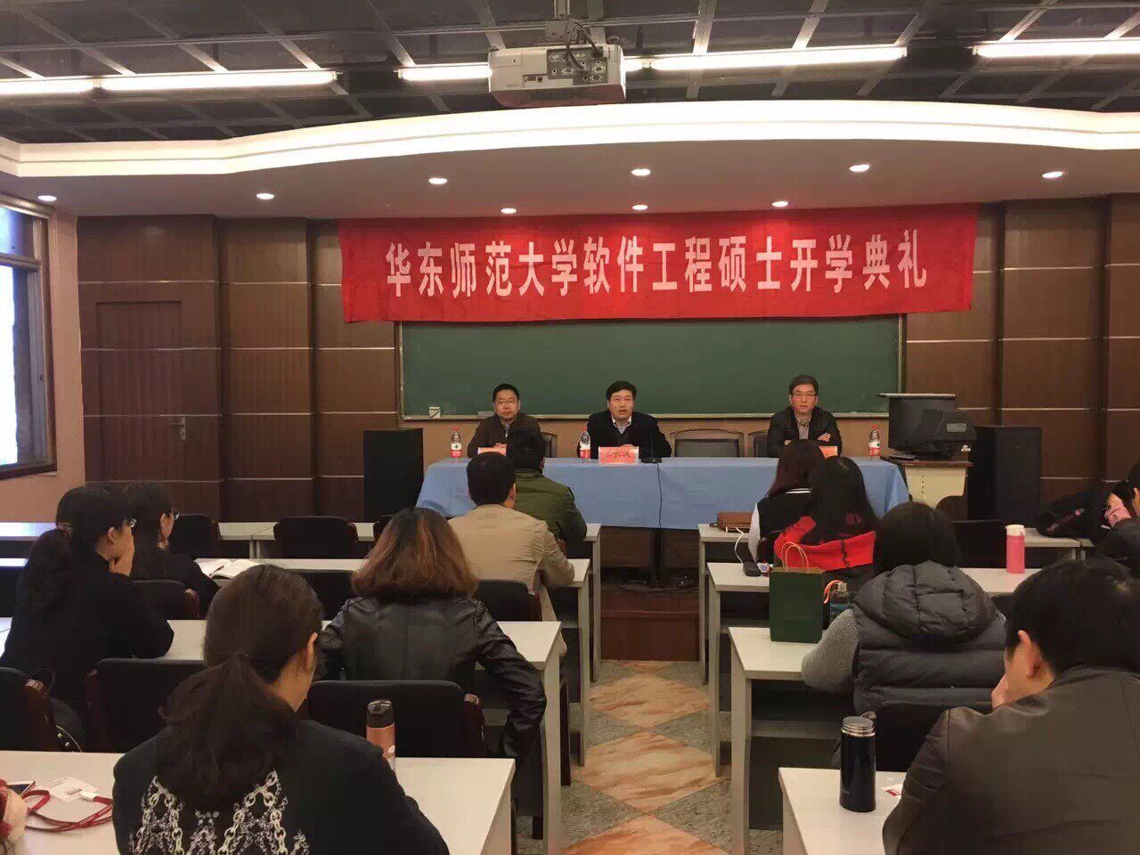 3月19日上午,成人教育学院在延安路教学点多功能厅举行华师大在职工程硕士2016级新生开学典礼。华东师范大学计算机科学和软件工程学院副院长王长波教授,我校成人教育学院院长陈志凌、党总支书记冯国文,及全体华东师范大学软件工程硕士2016级新生参加了开学典礼。