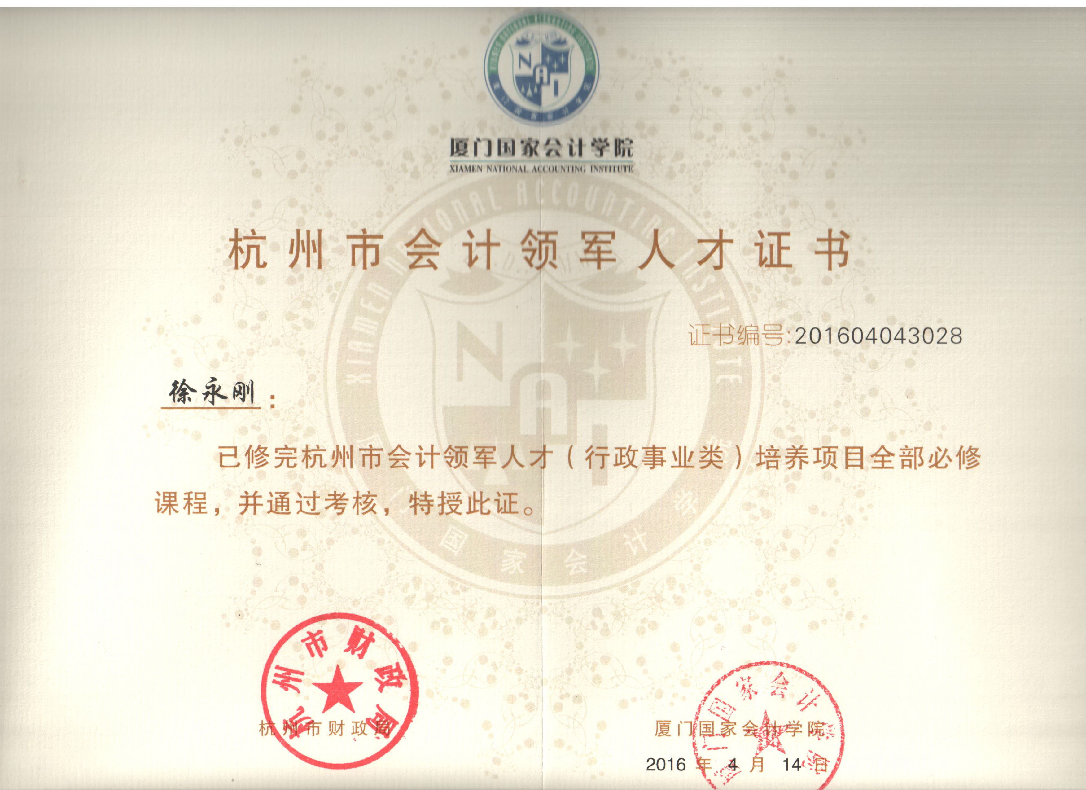 2016年4月14日,杭州会计领军人才(行政事业)班毕业典礼在厦门举行,我校计划财务处徐永刚顺利毕业,荣获杭州市会计领军人才证书。