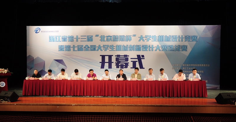 5月7日,浙江省第十三届大学生机械设计竞赛暨第七届全国大学生机械设计创新设计大赛选拔赛在我校隆重举行。第七届全国大学生机械创新设计大赛巡视员东南大学钱瑞明教授,浙江省教育厅高教处副处长王国银,杭州市教育局高教处处长孙青峰,浙江工业大学副校长华尔天,浙江省大学生机械设计竞赛委员会主任应富强,浙江省大学生机械设计竞赛委员会副主任顾大强,浙江省大学生机械设计竞赛委员会副主任顾容,浙江省机械工程学会秘书长许少宁,富阳区科技局副局长陈侃,北京精雕科技集团有限公司市场总监于洋,我校党委书记傅勤及副校长何树贵出席了大赛开幕式。开幕式由竞赛委员会副主任顾容主持。