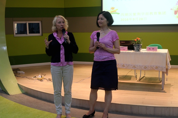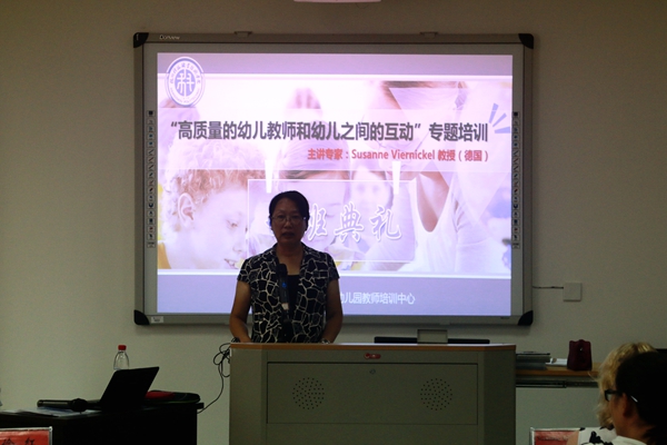 此次培训邀请了柏林爱丽丝-萨罗蒙社会科学应用大学Susanne Viernickel 教授担任主讲,德国埃尔福特大学应用社会科学系王蔚副教授担任翻译。培训中Susanne Viernickel 教授向学员们介绍了高质量的师幼互动对儿童早期发展的重要意义,并通过对德中教师与幼儿之间互动的一些录像和实例进行现场分析和讨论,通过实验性研究的结果归纳出有关高质量师幼互动的核心观点和基本特征,教会学生学习运用GINA(一日活动中设置和安排互动机会)对教育上的互动质量作自我评估。
