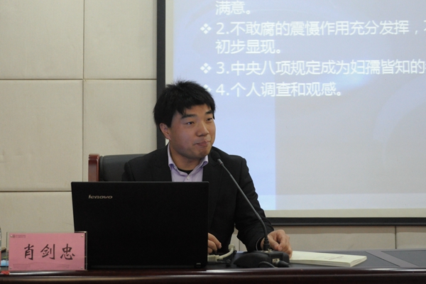 肖剑忠对我党历年来开展党风廉政建设的情况进行了分析。他指出,在习近平总书记的领导下,我党通过坚持从小切口着手稳步推进作风建设,坚持“老虎”和“苍蝇”一起打形成作风建设高压态势,坚持用好民主生活会、批评和自我批评等传统党建法宝助推作风建设,坚持以上率下推动全体党员干部树立良好作风,坚持完善制度体系让党员干部始终保持良好作风,坚持常抓不懈确保作风建设久久为功。肖剑忠表示,经过几年的建设,不敢腐的震慑作用已充分发挥,群众对党风廉政建设和反腐工作成效也给予了充分肯定,党员干部必须要适应全面从严治党的新要求,适应在严密制度笼子里工作生活的新环境。