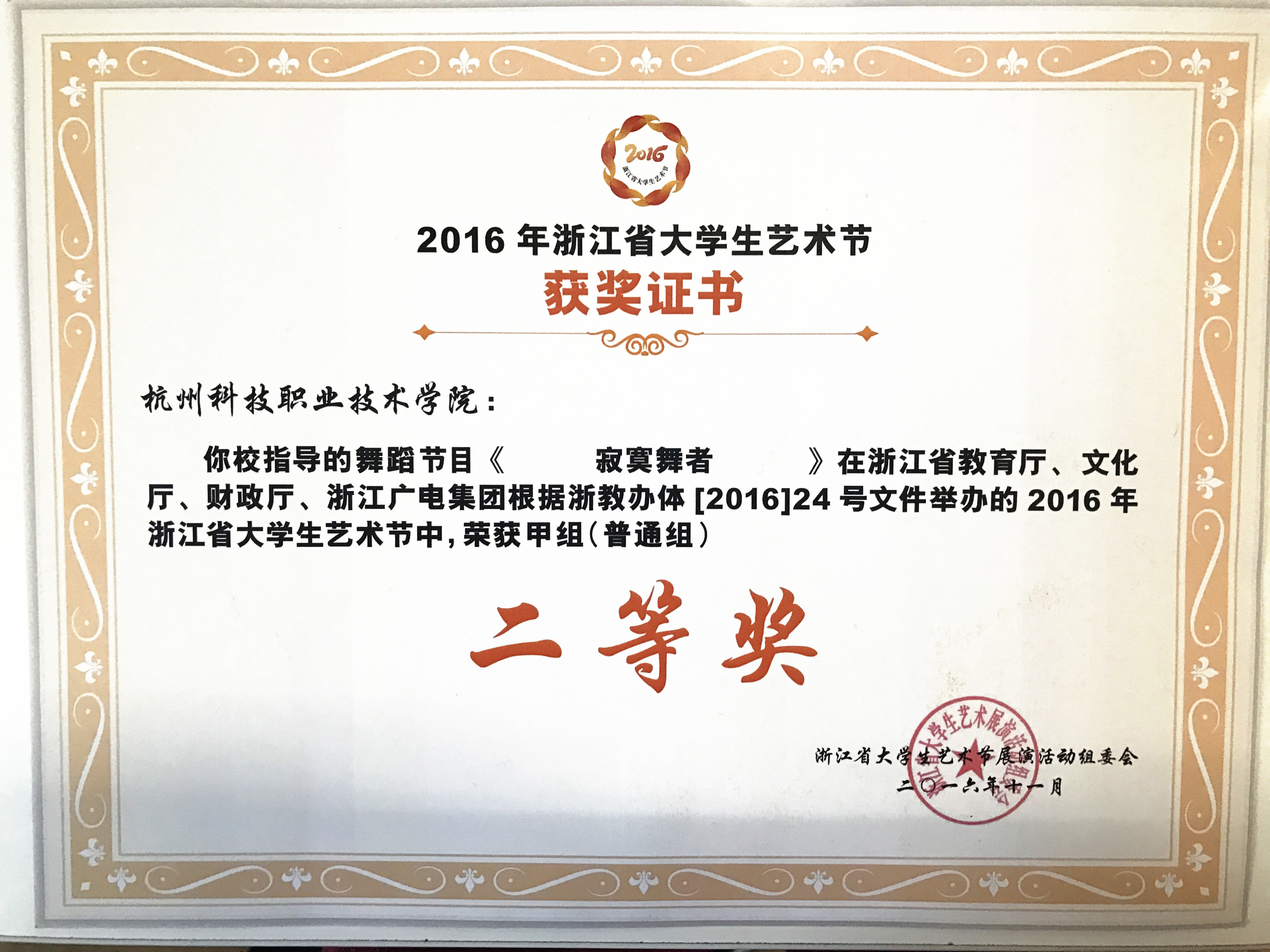 2016年浙江省大学生艺术节舞蹈展演于今年11月举行,我校大学生艺术团舞蹈团选送的《寂寞舞者》获得了大赛舞蹈甲组(普通组)二等奖。这是我校首次获得省级舞蹈类比赛奖项。