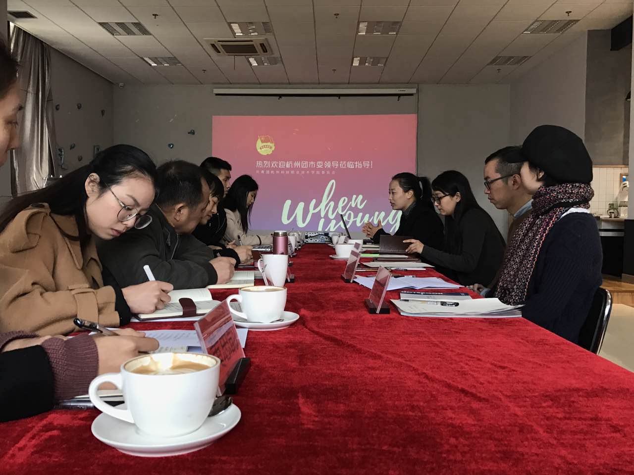 12月22日上午,共青团杭州市委第一调研组来我校调研共青团工作,调研组成员包括杭州市团校校长陆桂英、市青年文明号监察委员会办公室主任胡建荣及共青团杭州市委各部门代表。我校团委书记周俊炯、校团委委员代表、学生会主席参加了本次调研会议。