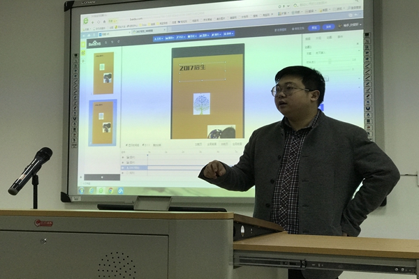 2017年1月12日下午,开放学院招生科在远教楼208教室召开了新媒体宣传技能培训讲座,学院资源建设中心潜宇超老师担任主讲人。