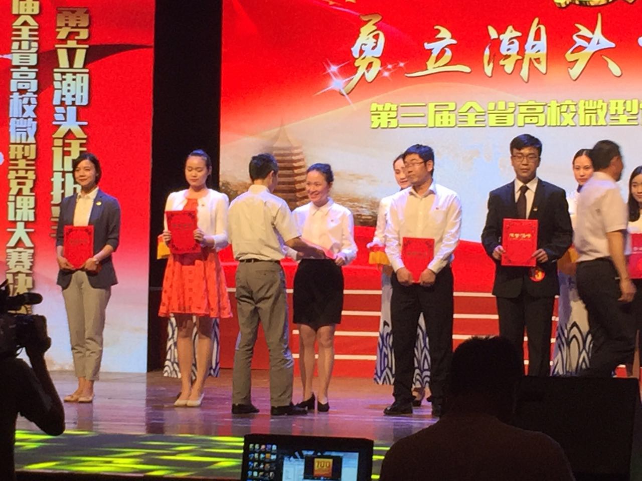5月25日下午,第三届全省高校微型党课决赛在浙江传媒学院小剧场举行,共有来自全省各高校的20名师生参加了比赛。代表我校参赛的旅游学院刘雯老师以《不忘初心献教育,以德施教话担当》为题,通过发掘身边优秀党员的先进事迹,以榜样故事传递正能量。刘雯老师的微型党课主题鲜明、语言精练、感染力强,最后获得了此次比赛的二等奖。