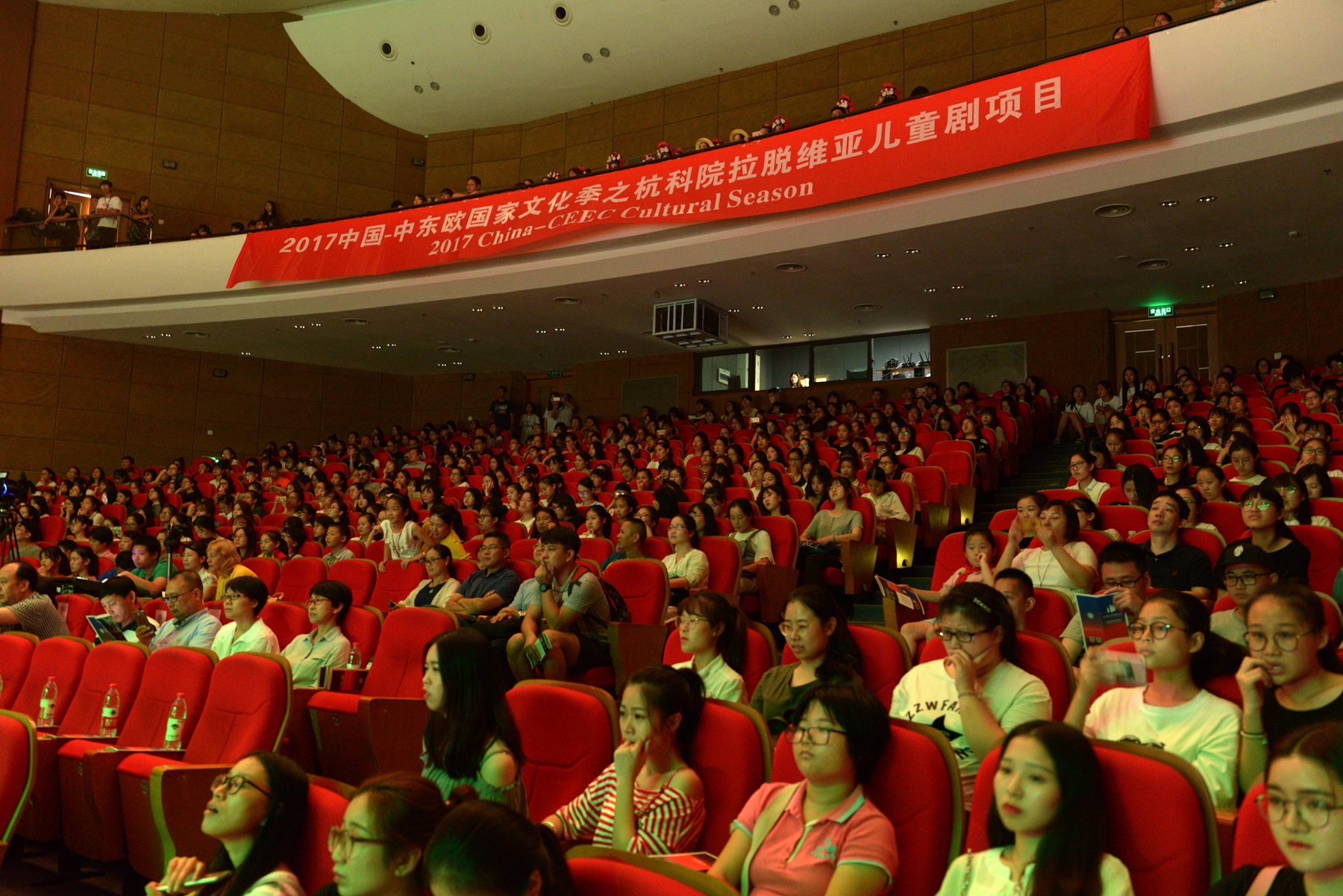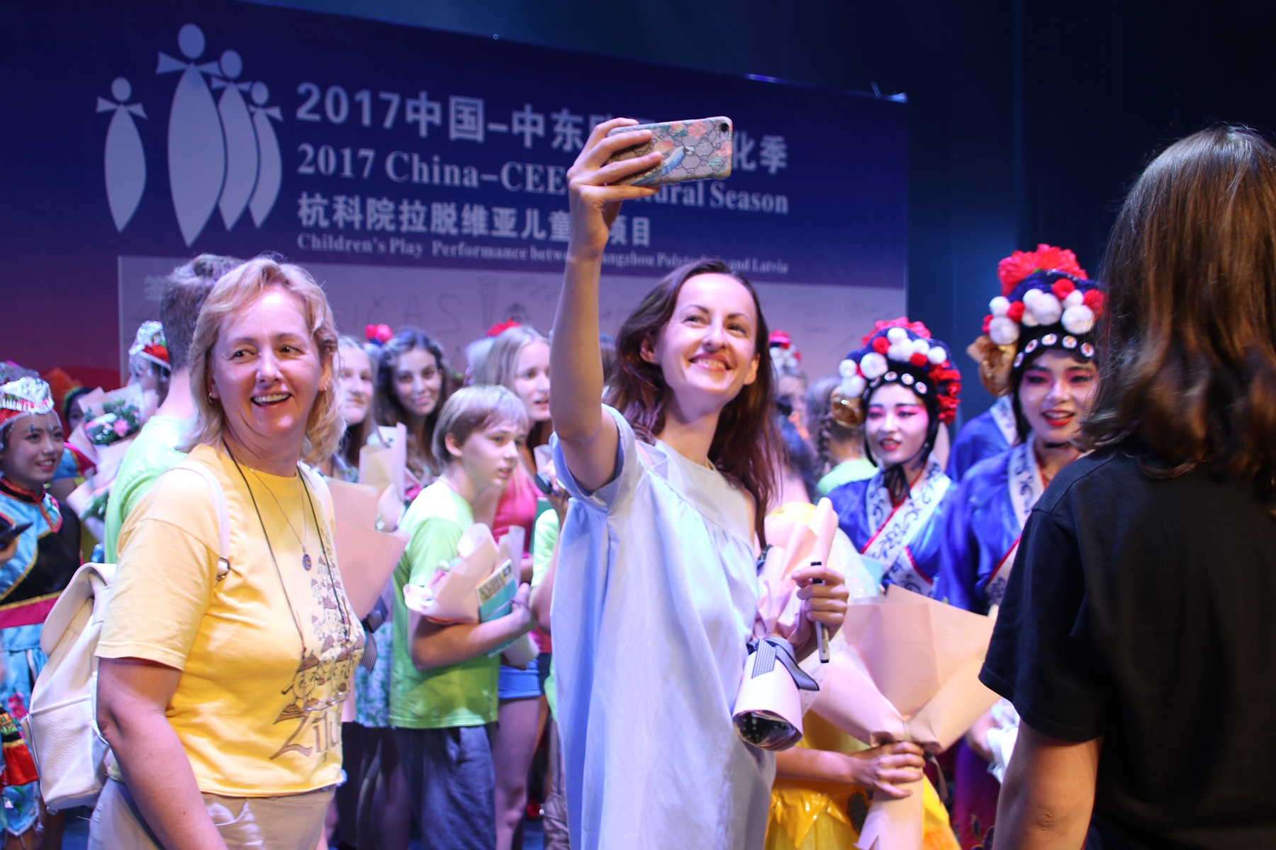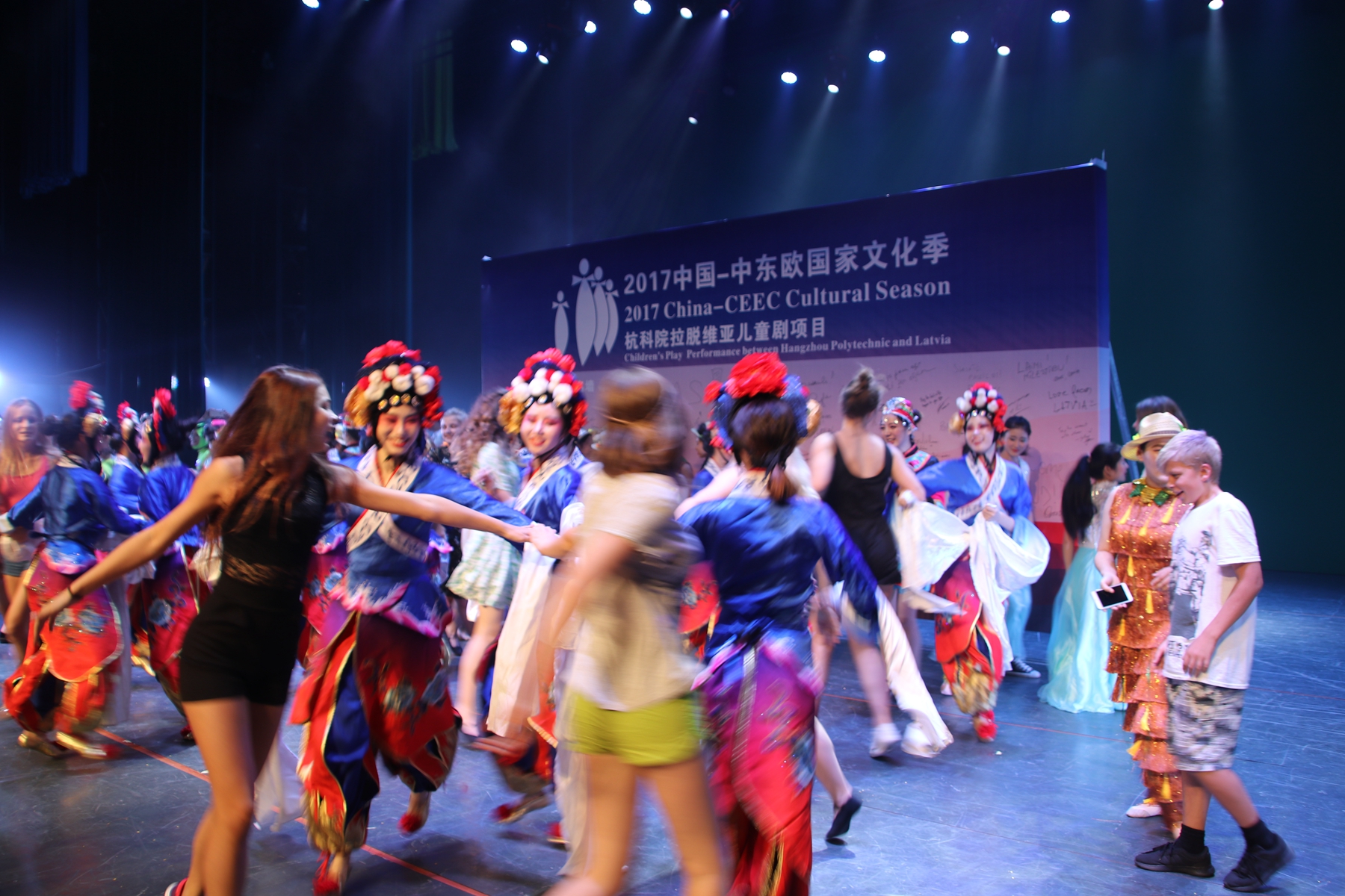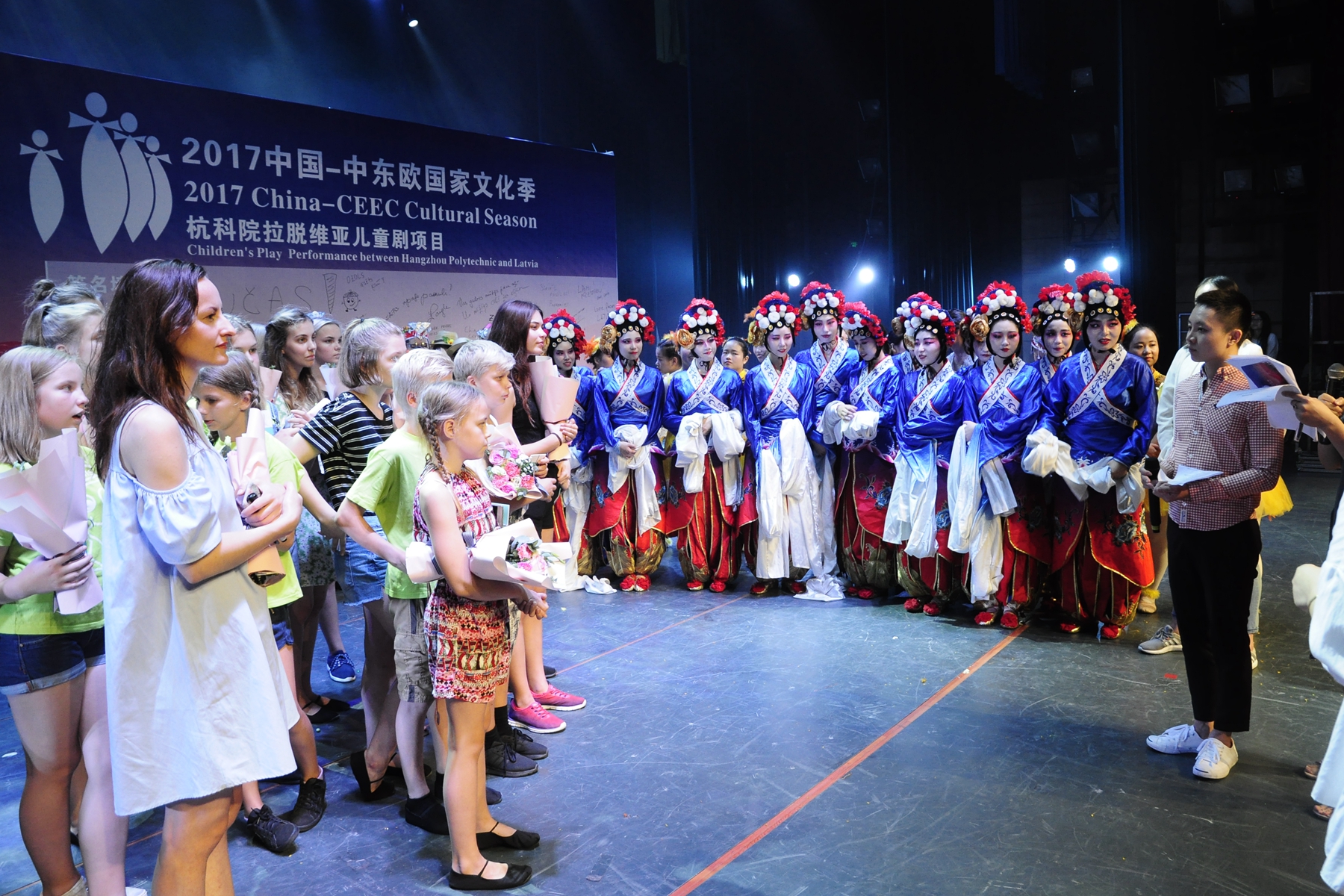 9月26日,由国家文化部主办,我校承办的“2017中国—中东欧国家文化季之杭科院拉脱维亚儿童剧项目”在我校文体中心大剧场隆重举行。来自拉脱维亚ZILUKS剧院的30位青少年演员演绎了经典儿童剧《Spriditis》,用他们的精彩表演展示了中东欧的特色文化。儿童剧演出结束后,我校大学生艺术团、教育学院的学生们献演了具有浓郁中华传统特色和浓郁民族风情的古筝演奏和歌舞节目。杭州市副市长陈红英、市政府副秘书长杨建华、市文广新局副局长李一青,我校全体校领导与近千名杭科院师生、富阳区市民代表一同现场观看演出。超过1万人通过我校官方微信直播平台在线观看演出。演出结束后,陈红英副市长与来自拉脱维亚的演员们亲切握手,并送上了鲜花和礼物。