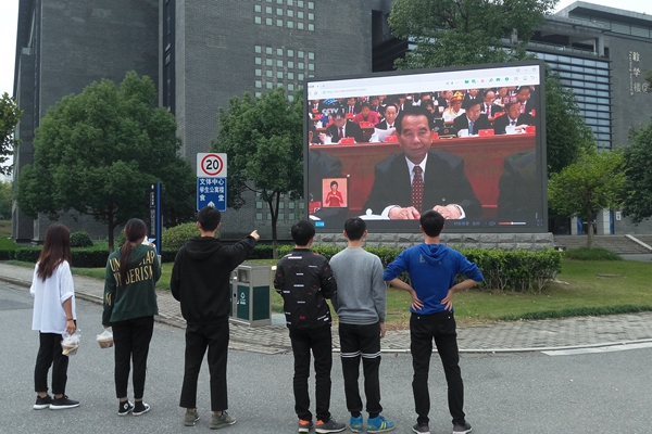 全校各党总支也纷纷组织党员教工在本总支的党员之家集中观看党的十九大开幕会现场直播。学校还通过学校大门口、食堂门口的电子屏直播十九大开幕会,吸引了不少师生驻足观看。