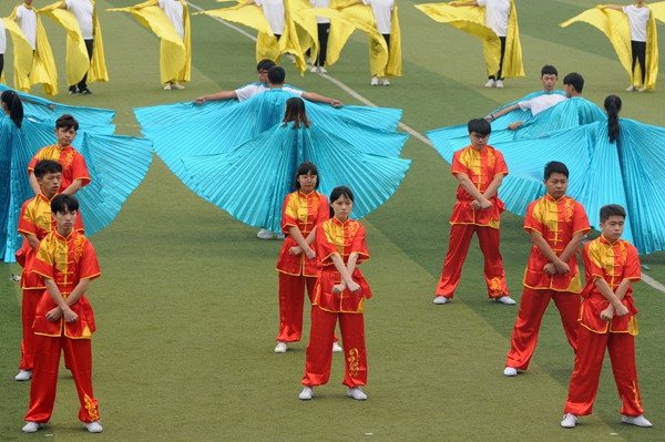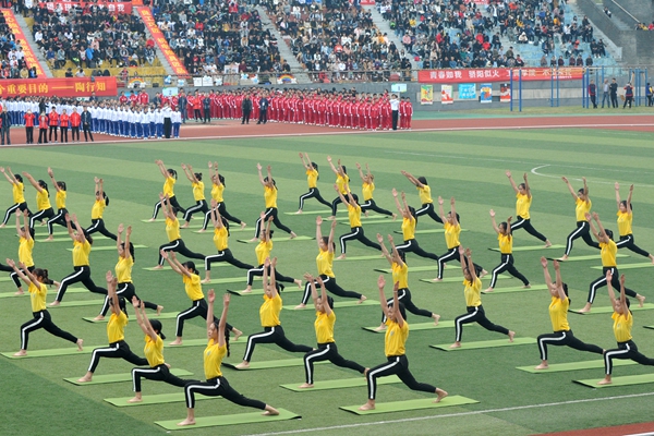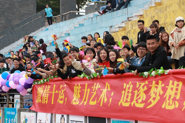 开放教育学院、艺术设计学院、信息工程学院、旅游学院进行了团体操表演,拖着丝带在空中逡巡的航模飞机、舞姿优美的瑜伽表演、由黄蓝两色组成的巨型电脑造型等赢得了现场观众的热烈掌声和喝彩。团体操表演技术后,学校还举行了师生广播操比赛,场面宏大。