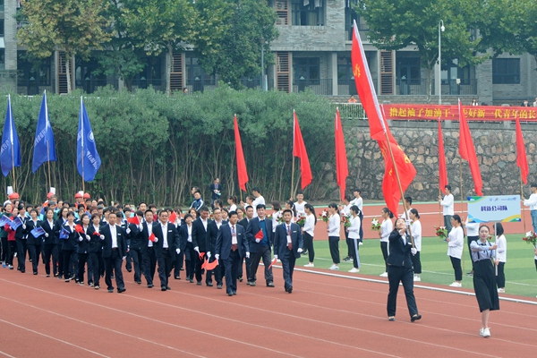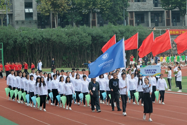 在激昂的运动员进行曲中,护旗手迈着有力的步伐护送五星红旗和校运动会会旗步入田径场,师生代表队喊着响亮的口号队依次走过主席台,外籍教师们也加入了公共教学部代表队。