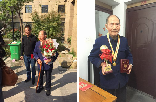 当走进小区看到等候在楼下的这位老战士,大家立刻心潮澎湃!余玉泉胸戴奖章,手捧奖杯(中共中央、国务院、中央军委颁发)的模样,让大家肃然起敬。