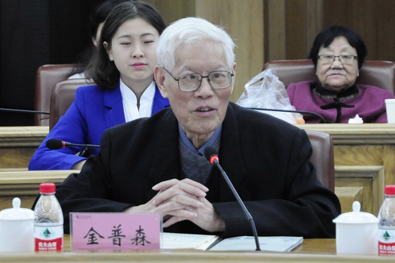 浙江大学教授、博导,原浙江历史学会会长金普森在会上发言。金普森表示,金海观洒向人间的都是爱,爱民族、爱国家、爱乡村、爱学校、爱教师、爱学生、爱民众、爱劳动、爱民主、爱科学。金海观的师德是湘师之魂。金海观的精神力量造就了一代人,他值得大家尊敬、缅怀和学习。