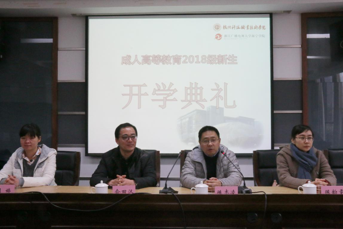 12月23日下午,我校成人教育海宁教学服务中心2018级新生开学典礼在高桥校区综合楼2109会议室举行。浙江电大海宁学院院长俞汉田、副院长周婷,我校成人教育学院院长陈志凌、副院长陈韵雯参加了开学典礼。