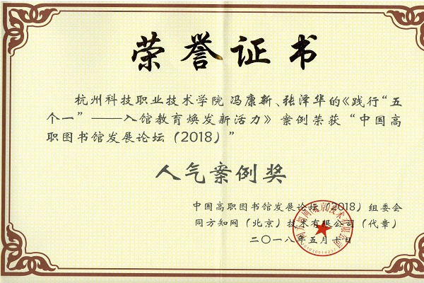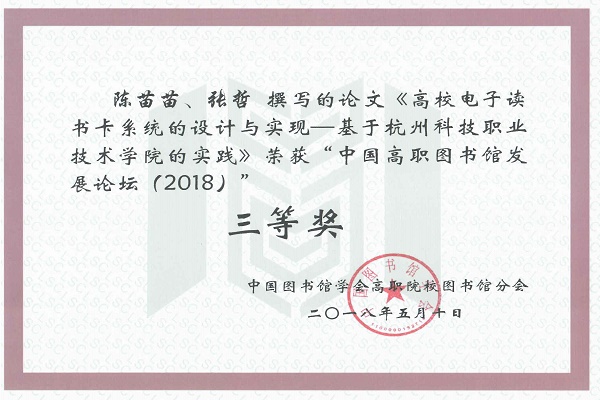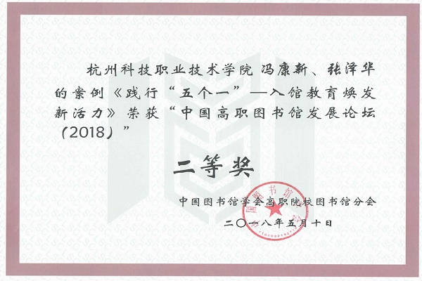 论坛以“新时代•新目标•新作为”为主题,以高职院校图书馆助力“优质校”建设为方向,得到了全国高职高专院校的积极响应和大力支持,共收论文224篇、案例129个。经过专家评审,我校图书馆冯康新、张泽华老师报送的《践行“五个一”—入馆教育焕发新活力》荣获案例二等奖和人气案例奖,网络信息中心陈苗苗、张哲老师撰写的论文《高校电子读书卡系统的设计与实现—基于杭州科技职业技术学院的实践》荣获论文三等奖。