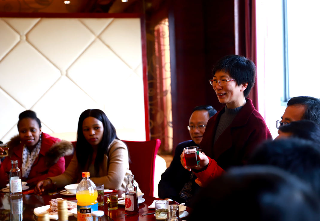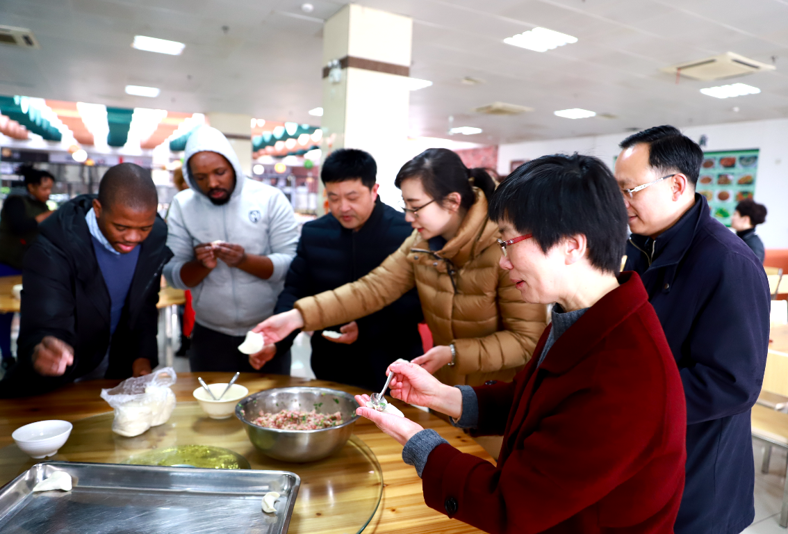 早上9点,许淑燕和学生处、保卫处、科新公司、机电工程学院等部门、学院的负责人一起,看望留校的10名南非留学生。许淑燕向留学生们介绍了中国年的来历,并向大家致以新春的祝福,希望大家在新的一年中,认真学习专业技能,将来能为“一带一路”的建设和发展作贡献。许淑燕还和留学生们一起写“福”字、写春联,手把手地教大家包起了饺子,并和大家一起吃了一顿“团圆饭”。