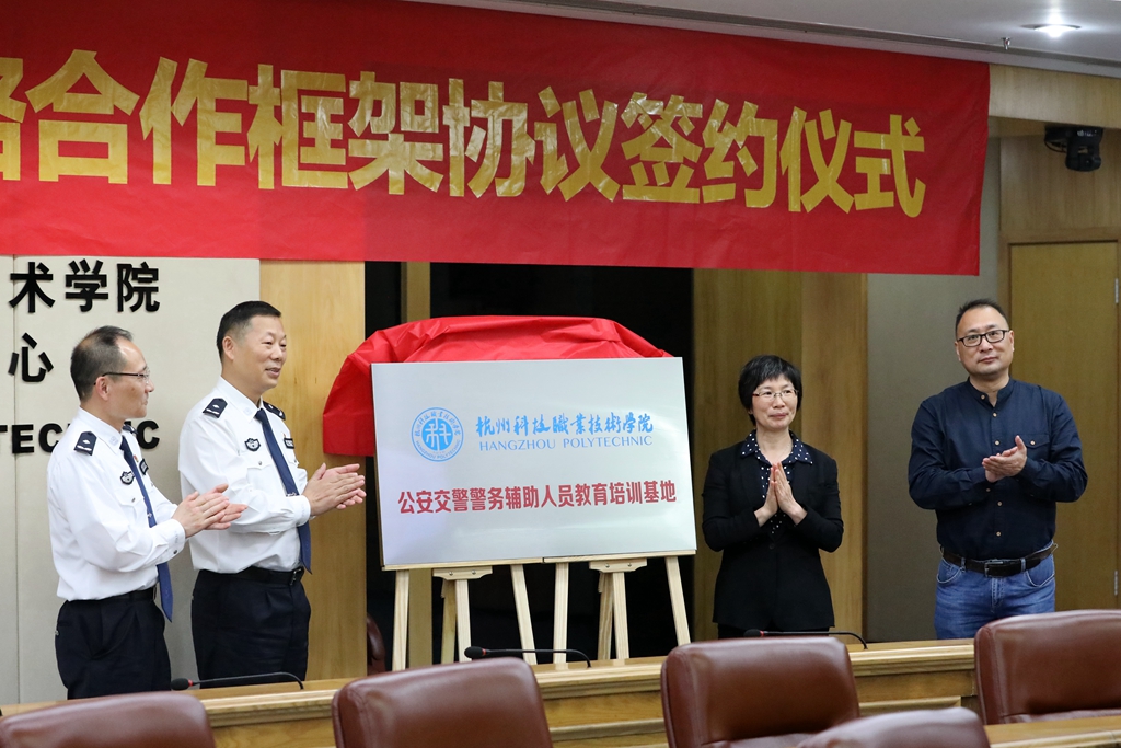 5月15日,我校和杭州市公安局交通警察支队战略合作框架合作协议签署仪式暨杭州科技职业技术学院公安交警警务辅助人员教育培训基地授牌仪式在高桥校区图书馆国际会议中心举行。校长许淑燕、副校长袁俊,市交警支队政委王叶飞、政治处主任闫春雷,继续教育学院主要负责人,市交警支队政治处、警务保障处相关负责人及辅警代表等参加了仪式。