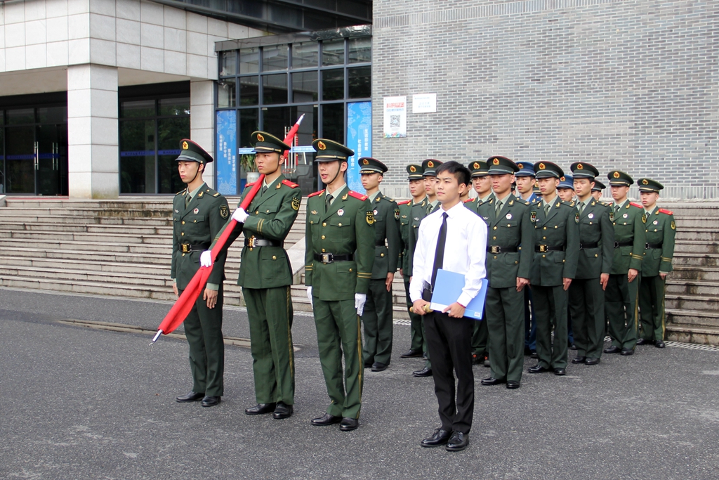 由18名退伍大学生组成的国旗护卫方阵,英姿飒爽地护送鲜艳的五星红旗入场。伴随着庄严的《中华人民共和国国歌》,五星红旗冉冉升起,迎风飘扬。在场的每一位师生向国旗行注目礼,高唱国歌,表达对祖国无限的热爱和崇高的敬意。