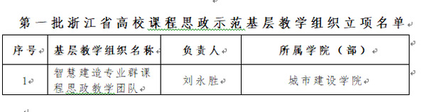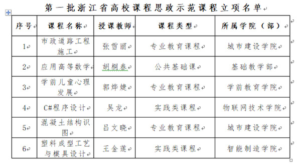 近日,浙江省教育厅公布了第一批省级课程思政教学项目建设立项名单,我校收获满满,申报的三类共计11个项目全部获得立项。其中,《市政道路工程施工》等6门课程入选“浙江省高校课程思政示范课程”;《高职汽修专业课程思政教学改革总体设计和实践路径研究》等4个项目入选“浙江省高校课程思政教学研究项目”,智慧建造专业群课程思政教学团队入选“第一批浙江省高校课程思政示范基层教学组织”。