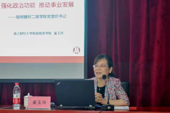 浙江财经大学财政税务学院党委书记童玉玲应邀做了《强化政治功能,推进事业发展——如何做好二级单位党组织书记》专题报告,她从“做什么、怎么做、怎么做得更好”三个层面,深入浅出地阐述了高校二级党组织的职责定位,介绍了建立健全二级党组织工作机制以及开展党建品牌创建等方面的创新方法和有益经验,并分享了开展全国高校党建工作标杆院系培育点工作的具体做法和经验。