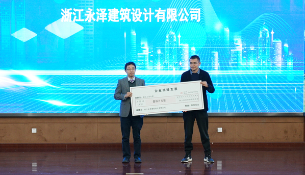 (浙江永泽建筑设计有限公司院长张永刚为浙江工业大学捐赠教育基金,土木工程学院院长孙宏磊代表学校受赠)