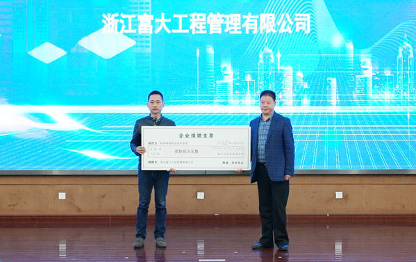 (浙江富大工程管理有限公司董事长徐玉明为杭科院捐赠教育基金,城市建设学院党总支副书记陈龙代表学院受赠)