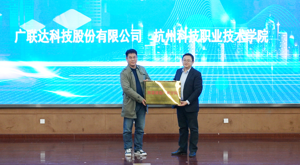 (广联达科技股份有限公司总经理谢军与杭州科技职业技术学院城市建设学院院长金波共同为智慧建造产业学院揭牌)