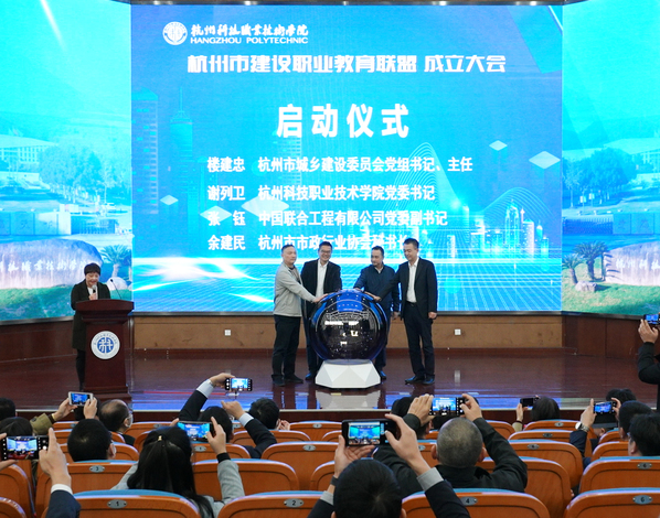 楼建忠、谢列卫、张钰、余建民共同按下启动球,宣布杭州市建设职业教育联盟正式成立。杭州市建设职业教育联盟由杭州科技职业技术学院发起,由杭州市城乡建设委员会以及各区县住房和城乡建设局、杭州市建筑业等协会、浙江工业大学、浙江科技学院等院校、中国联合工程有限公司、浙江省建工集团有限责任公司和杭州市市政工程集团有限公司等知名建筑企业共同参与。联盟以资源融合、互联互通、共建共享、携手发展为原则,将在人才培养、协作交流和科研合作等方面开展工作,促进杭州市建筑产业改革和高质量发展。