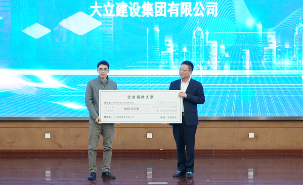 (大立建设集团有限公司董事长傅宝剑为杭科院捐赠教育基金,城市建设学院副院长范大波代表学院受赠)
