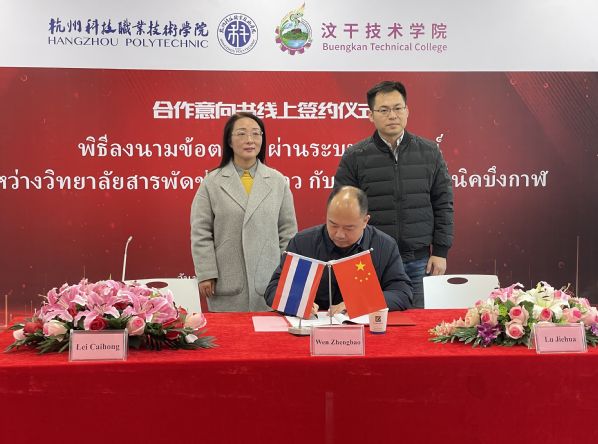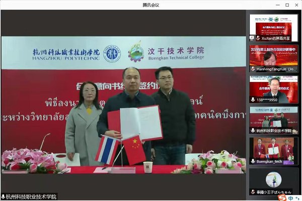 泰国汶干技术学院位于泰国汶干府,是泰国高等教育委员会认定的高职院校,学校现开设工商管理、信息和通信技术、专业护理等13个专业,在校生2000余人。2020年10月,我校举办的首期对泰师资在线培训拉开了两校合作的序幕,也开启了我校与泰国的合作交流之路。目前,已有20名泰国汶干技术学院学生注册成为我校2021级留学生,是我校留学生的类别的重要组成。本次签约,将不断推动两校间合作不断深入,打造“十四五”开局之年我校国际教育工作的新起点。