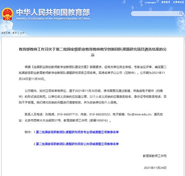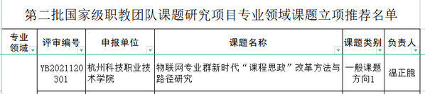 近日,教育部教师工作司公示了第二批国家级职业教育教师教学创新团队课题研究项目遴选结果,校长温正胞主持的《物联网专业群新时代“课程思政”改革方法与路径研究》课题成功立项。