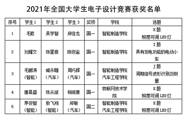 近日,2021年全国大学生电子设计竞赛全国总决赛落下帷幕。我校获得全国一等奖4项,二等奖1项的历史最佳成绩,包揽高职高专组所有竞赛题目的一等奖,一等奖总数居全国高职院校第二,省内高职院校第一。
