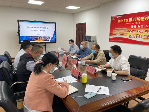 4月27日,杭州市职业教育与成人教育协会在杭州科技职业技术学院城区校区召开2022年度工作研讨会。市职成教协会会长、杭州科技职业技术学院校长温正胞,市职成教协会副会长、杭州科技职业技术学院副校长袁俊,市职成教协会副会长、杭州明珠专修学校校长毛益飞及各分会秘书长出席会议。会议由市职成教协会秘书长陈志凌主持。