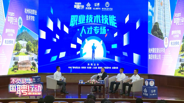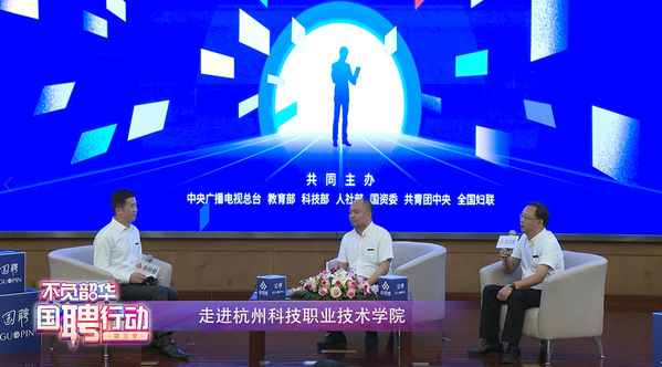 6月14日,由中央广播电视总台联合教育部、科技部、人社部、国资委、共青团中央、全国妇联等七部委共同发起,央视频携手国投人力、中华职业教育社共同主办的“国聘行动”第三季“不负韶华 国聘行动”职业技术技能人才专场走进杭州科技职业技术学院,通过直播宣讲、现场招聘等形式,为职业院校毕业生搭建展示风采的舞台,高效助力职业院校毕业生等重点群体就业工作。作为“国聘行动”职业技术技能人才招聘浙江专场的唯一高职院校,杭州科技职业技术学院通过云宣讲活动推动青年学子、技术人才和用人单位实现精准对接。