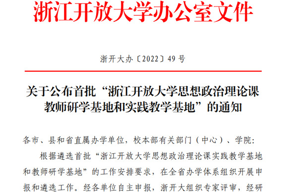 近日,首批“浙江开放大学思想政治理论课教师研学基地和实践教学基地”评选结果揭晓。由原杭州广播电视大学(现为杭州开放大学)申报的“伟大抗日精神”主题思想政治理论课实践教学基地从18个申报项目中脱颖而出,成功入选“浙江开放大学首批思政课实践教学基地”。