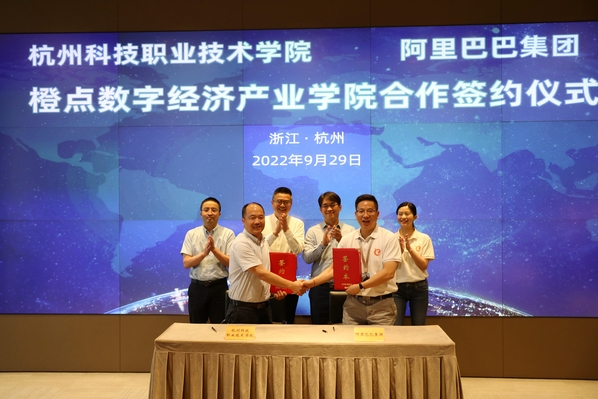 9月29日,由我校与阿里巴巴集团合作共建的全国首家“橙点数字经济产业学院”签约仪式在阿里巴巴西溪园区举行。双方签署共建合作协议,授牌成立“‘双师型’教师培养培训基地”“新零售管理实训实习基地”“新零售管理培训基地”。阿里巴巴助力共富小组秘书长仝腾、阿里巴巴淘宝教育副总经理刘国峰、阿里巴巴助力共富小组总监陆昕,党委书记谢列卫、校长温正胞、副校长潘建峰出席签约仪式。阿里巴巴淘宝教育校企合作总监张雷主持。