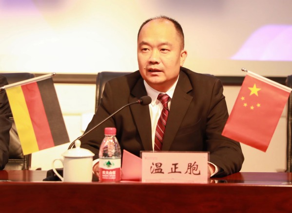 温正胞在致辞中介绍了我校发展历程、办学规模和近年来取得的国际教育办学成果。他表示,我校始终致力于推动国际教育合作和跨文化交流,以服务教育国际化国家发展战略为己任。他强调,学校将以此次中德合作办学项目为契机,全面整合校内对德资源,依托两校优势资源和专业领域,实现资源共享、优势互补、合作共赢,促进中德职教合作效益和层次的提升,打造中德职教合作新样板。