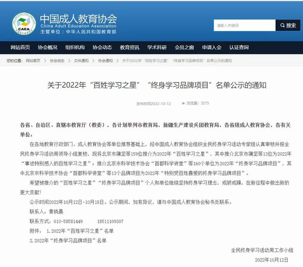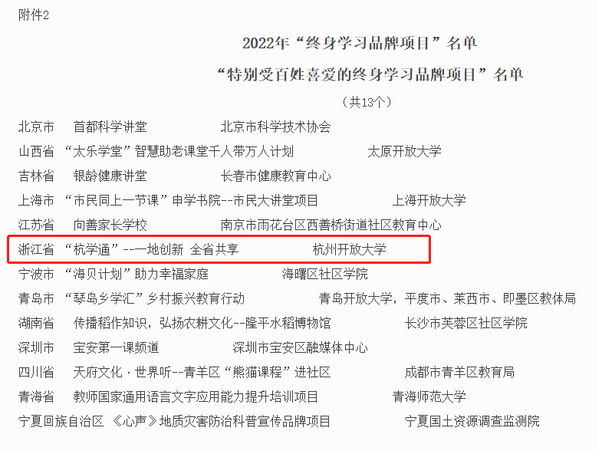 在各地教育行政部门、成人教育协会等单位推荐基础上,本次全民终身学习活动周领导小组和中国成人教育协会联合推荐了160个项目为2022年“终身学习品牌项目”,其中包括《“杭学通”——一地创新 全省共享》在内的全国 13个项目被优中选优成为2022年“特别受百姓喜爱的终身学习品牌项目”。