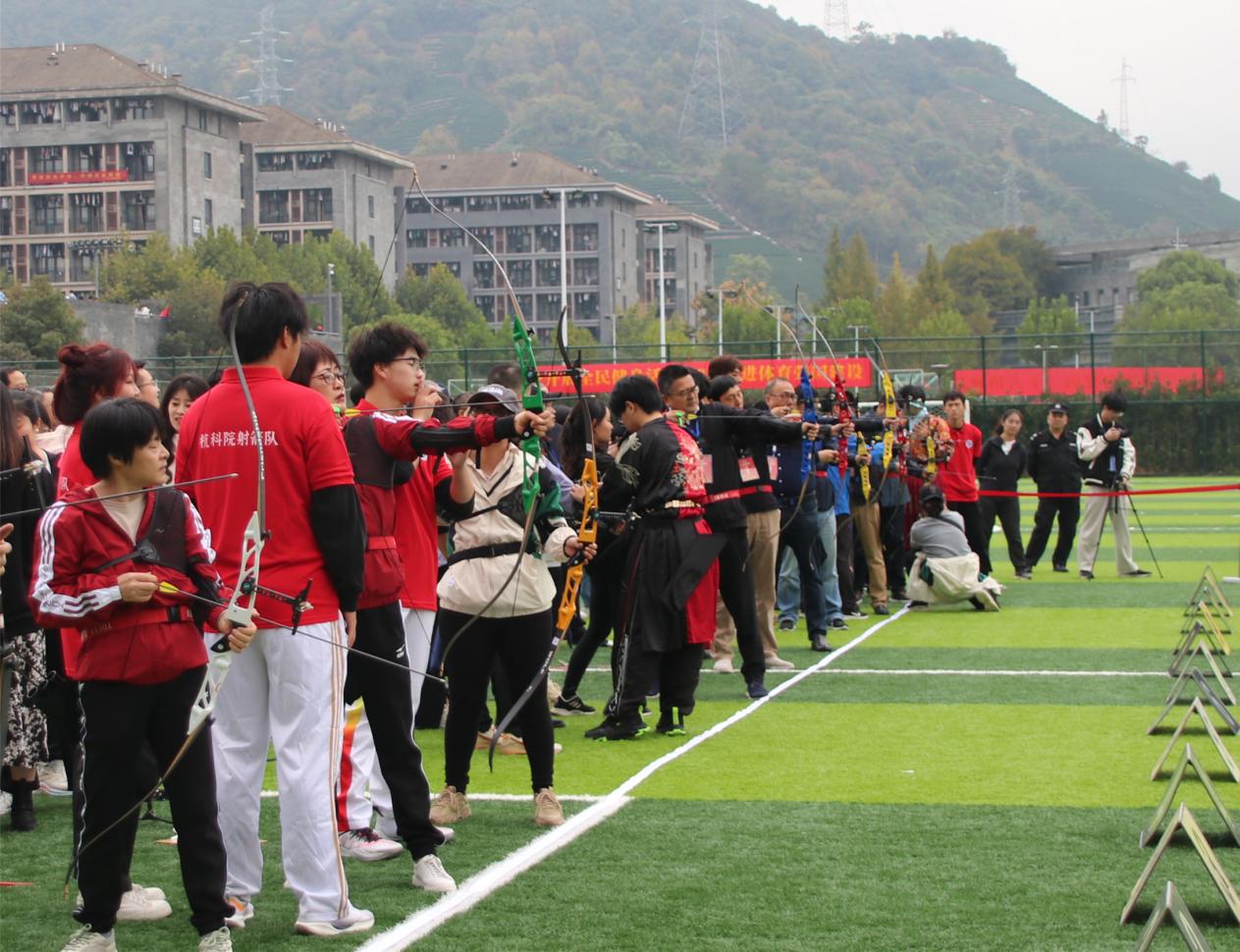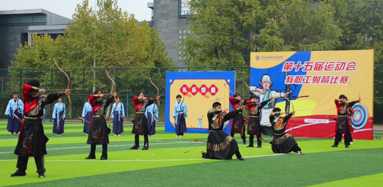 开幕式结束后,校领导来到足球场,观看射艺风采展示,并为教工趣味运动会射箭比赛举行开弓仪式。
