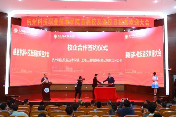 欢迎大会现场举行了校企合作签约仪式和捐赠仪式。上海三菱电梯有限公司浙江分公司、浙江中言建设管理有限公司、杭州实业投资集团有限公司、每平每屋(上海)科技有限公司、杭州智鲸科技有限公司、杭州仁和酒店集团与我校智能制造学院、城市建设学院、物联网技术学院、艺术设计学院、商务管理学院、旅游管理学院分别签约。上海三菱电梯有限公司浙江分公司、浙江金固股份有限公司、浙江钜元建设集团有限公司、苏州巴托拉数字科技有限公司与我校智能制造学院、城市建设学院、物联网技术学院互赠捐赠支票和捐赠证书。