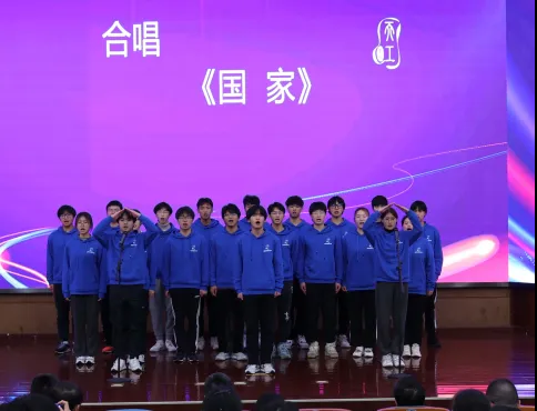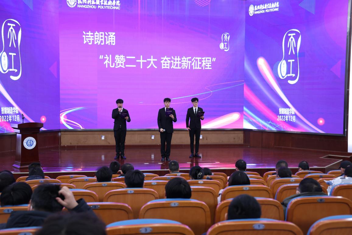 活动现场还播放了视频《天工 这十年》,一同回顾了智能制造学院十年间取得的重要成就。三位学生代表表演“礼赞二十大 奋进新征程”诗朗诵,数字化2202班学生齐声合唱歌曲《国家》。